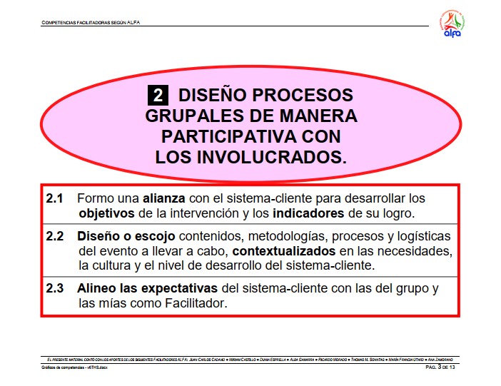 ALFA fue desarrollando las competencias del facilitador/a; éstas se fueron validando a lo largo de los años y – actualmente – se promueven, difunden y aplican en el quehacer de sus integrantes como parte intrínseca del arte y ciencia de la Facilitación de acuerdo a los lineamientos propuestos por sus fundadores/as.